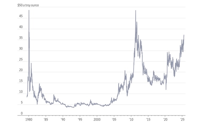 Историческая динамика цен на серебро. Источник: The Wall Street Journal