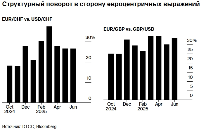 В результате произошёл сдвиг в объёмах торговли. Около 15–30 % контрактов, привязанных к доллару по отношению к основным валютам, были переведены на евро, если сравнивать данные Depository Trust & Clearing Corporation за первые пять месяцев этого года с последними пятью месяцами 2024 года. Также есть признаки того, что евро используется в качестве убежища — традиционно в роли доллара — и для ставок на крупные движения.