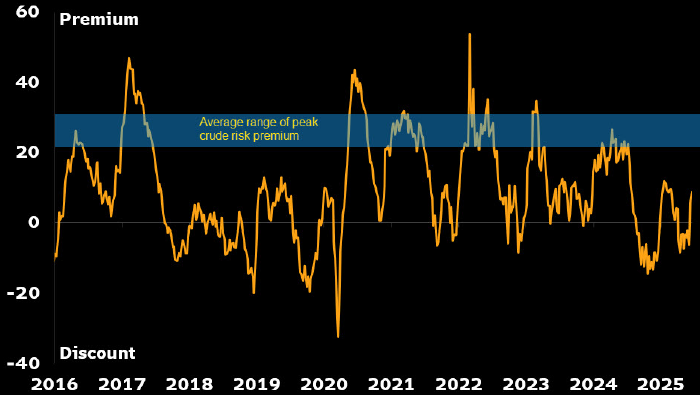 По состоянию на 12 июня премия за риск в ценах нефти WTI составляла $1,03 за баррель, а 20 июня — уже $8,56 за баррель, пишет эксперт. По его словам, средняя пиковая премия за риск во время крупнейших геополитических конфликтов последних десяти лет составляла $25–30 за баррель, что соответствует котировкам WTI на уровне $90–100 за баррель с учетом «справедливой» цены в $67 за баррель по состоянию на 20 июня.