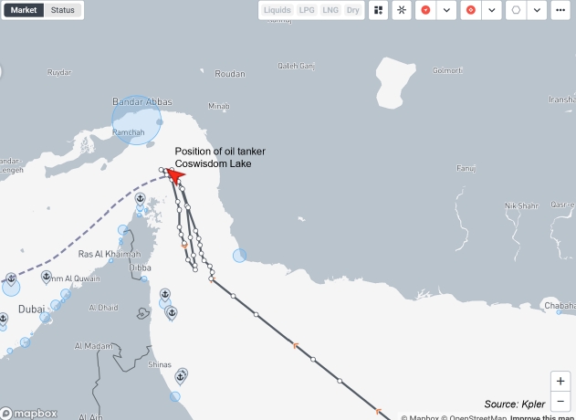 Согласно данным Kpler и LSEG, очень большой танкер-супертанкер для перевозки сырой нефти Coswisdom Lake достиг пролива в воскресенье. Однако он развернулся и направился на юг. В понедельник он снова повернул обратно и продолжил свой путь в сторону порта Зирку в Объединённых Арабских Эмиратах.
