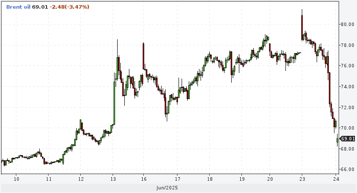 Цены на нефть Brent упали до 68,23 доллара за баррель в начале азиатских торгов 24 июня. Падение, последовавшее за сессией «американских горок» в понедельник, которая закончилась резкими потерями, привело к тому, что цены опустились ниже своего уровня 12 июня, за день до нападения Израиля на Иран. Цены на золото также упали.