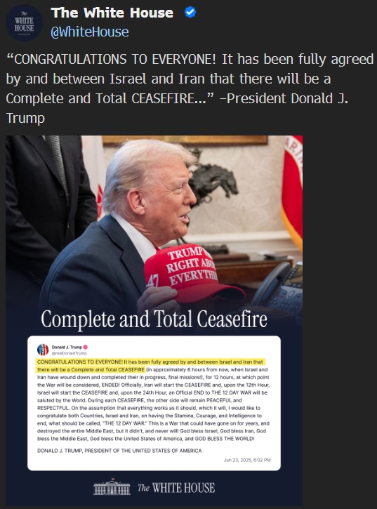 «ПОЗДРАВЛЯЮ ВСЕХ! Между Израилем и Ираном достигнута полная договоренность о полном прекращении огня…» — Президент Дональд Трамп