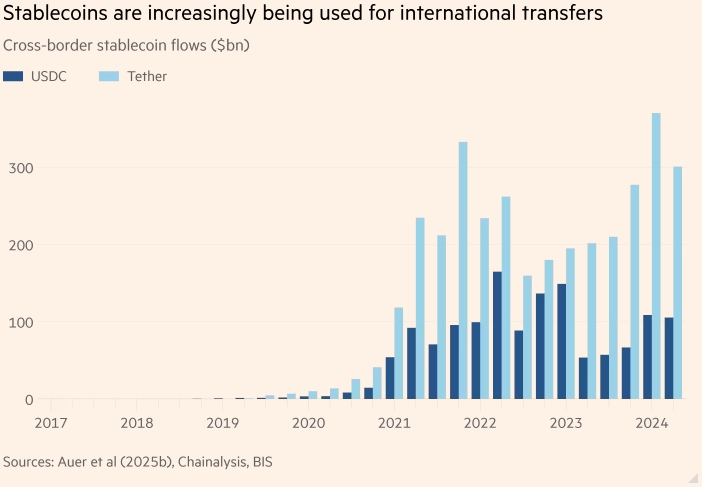 Стейблкоины все чаще используются для международных переводов. Трансграничные потоки стейблкоинов (млрд долл. США). Источники: Auer et al (2025b), Chainaанализ, BIS.
