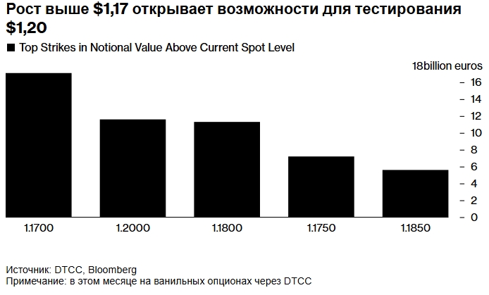 За последние три дня евро вырос на 1,6%, и теперь его стоимость приближается к отметке в 1,17 доллара. Это зона, в которой сосредоточен наибольший объём опционов на покупку евро. По данным DTCC, это может стать потенциальной точкой перегиба.