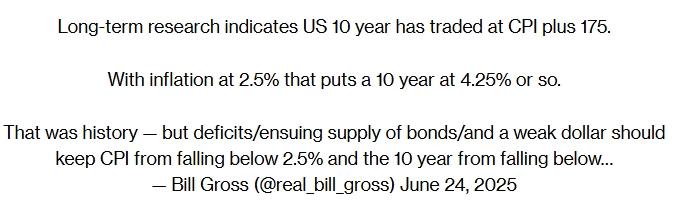 Долгосрочные исследования показывают, что 10-летние облигации США обычно торгуются с премией в 175 базисных пунктов к ИПЦ. При инфляции в 2,5% это означает, что 10-летние облигации будут стоить около 4,25%. Однако дефицит бюджета, предложение облигаций и ослабление доллара должны удержать ИПЦ от падения ниже 2,5%, а доходность 10-летних облигаций — от снижения…— Билл Гросс (@real_bill_gross) 24 июня 2025 г.