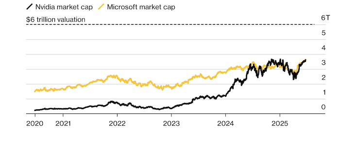 Рыночная капитализация Nvidia и Microsoft. Источник: Bloomberg