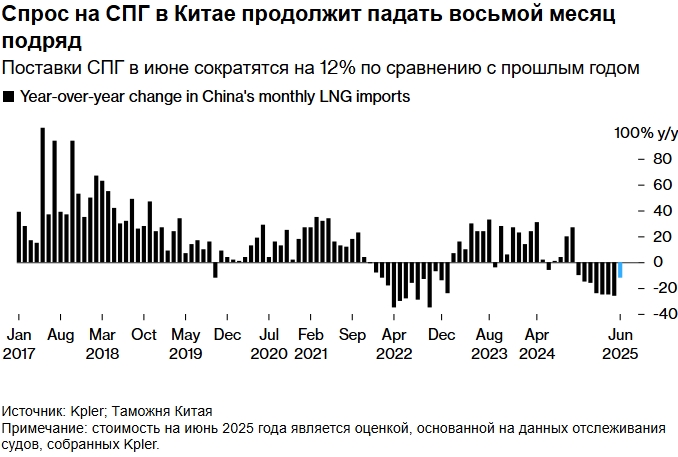 Китай, который в 2024 году был крупнейшим импортёром СПГ, в этом году закупает меньше из-за увеличения поставок трубопроводного газа из России и Центральной Азии, а также роста внутреннего производства. Страна также сократила закупки из-за высоких спотовых цен и даже начала перепродавать поставки за рубеж, чтобы получить больше прибыли.