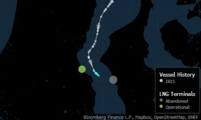 Согласно информации, судно Iris подаёт сигналы о том, что его следующим пунктом назначения будет порт Сабетта, где находится отдельный объект Ямал СПГ, который не находится под санкциями. Однако ранее в этот день судно прошло мимо этого объекта.