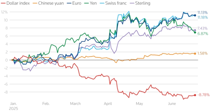 Динамика индекса доллара и ряда его основных конкурентов в процентах с начала 2025 года.