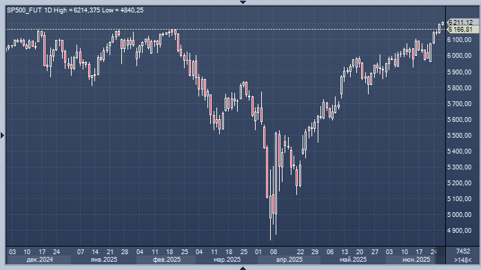 К 10:55 по московскому времени фьючерсы на S&P 500 выросли на 0,11%, достигнув отметки в 6202,00. Это стало историческим максимумом внутри дня, который был зафиксирован в конце февраля на уровне 6147,43.
