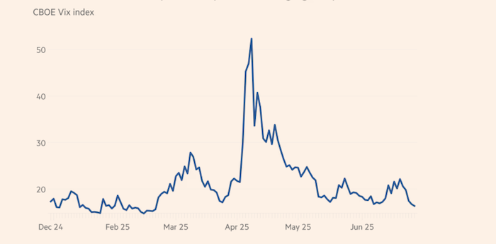 График индекса волатильности CBOE Vix показывает обвал волатильности американского фондового рынка после всплеска в апреле. Источник: The Financial Times