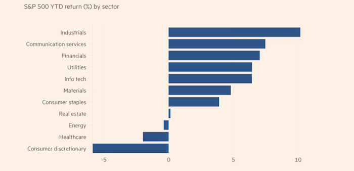 Столбчатая диаграмма доходности S&P 500 с начала года по секторам показывает, что промышленность лидировала на американском фондовом рынке в этом году. Источник: The Financial Times