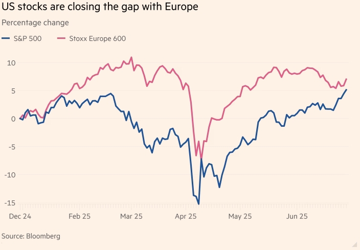 Уолл-стрит после тарифных потрясений вернулась к рекордным максимумам, что резко сократило разрыв с европейскими акциями. Это стало испытанием для инвесторов, которые делали ставку на то, что эпоха исключительности для рынков США подходит к концу.