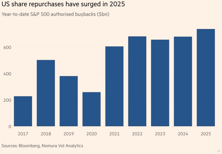 Выкуп акций в США резко возрос в 2025 году. Авторизованные выкупы акций S&P 500 с начала года (млрд долл. США). Источники: Bloomberg, Nomura Vol Analytics