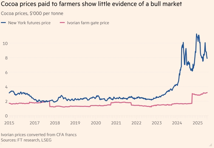 Цены на какао, уплачиваемые фермерам, не демонстрируют существенных признаков бычьего рынка. Цены на какао, тыс. долл. за тонну. Цена фьючерса в Нью-Йорке. Цена у ворот ивуарийской фермы. Ивуарийские цены, конвертированные из франков CFA. Источники: исследования FT, LSEG