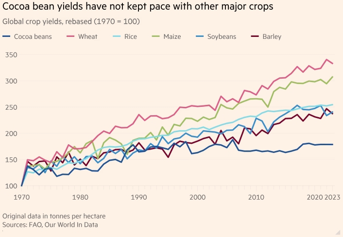 С начала 2023 года фьючерсы на какао в Нью-Йорке и Лондоне, которые в течение многих лет торговались в относительно узком диапазоне, выросли более чем в три раза, поскольку предложение не удовлетворяет спрос. Большинство проблем в этом секторе связано с Кот-д’Ивуаром и Ганой, которые вместе производят около двух третей мирового объёма какао-бобов.