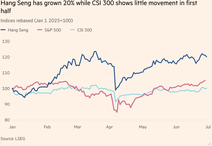 Hang Seng вырос на 20%, в то время как CSI 300 демонстрирует незначительное движение в первой половине года. Пересчет индексов (1 января 2025 г. = 100). Hang Seng, S&P 500, CSI 300 Источник: LSEG