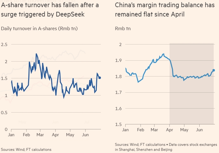 Оборот акций A-класса упал после всплеска, вызванного DeepSeek. Ежедневный оборот акций класса А (в трлн юаней). Маржинальный торговый баланс Китая остается неизменным с апреля. юаней, трлн. Источники: Wind; расчеты FT. Данные охватывают фондовые биржи Шанхая, Шэньчжэня и Пекина.