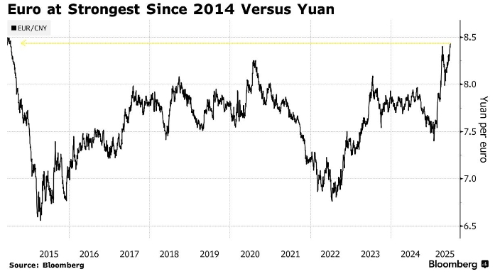 Укрепление евро по отношению к юаню может создать благоприятные условия для Пекина. Китайские экспортёры ищут другие рынки, чтобы смягчить влияние американских пошлин.