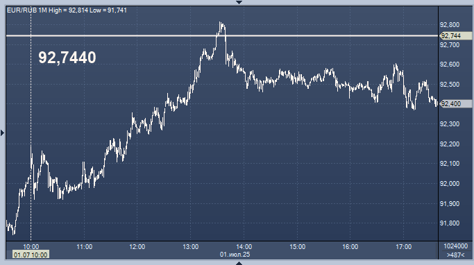 - 92,7440 рубля за 1 евро