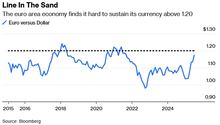 Красная линия. Экономике еврозоны сложно поддерживать курс своей валюты выше 1,20. Источник: Bloomberg