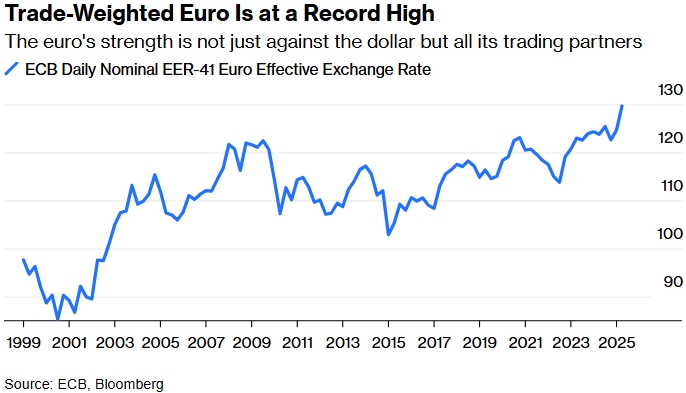 Торгово-взвешенный евро достиг рекордно высокого уровня. Сила евро заключается не только в его отношении к доллару, но и ко всем его торговым партнерам. Источник: ЕЦБ, Bloomberg