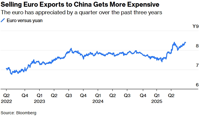 Продажа евро-экспорта в Китай становится дороже. За последние три года евро вырос на четверть. Источник: Bloomberg