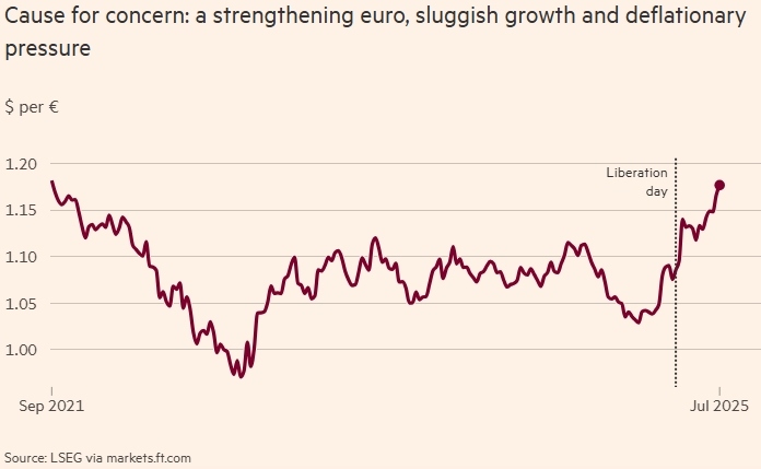 Поскольку в июне инфляция достигла среднесрочного целевого показателя ЕЦБ в 2%, и, по прогнозам, в следующем году временно снизится до 1,6%, ведущие европейские центральные банкиры всё больше беспокоятся — особенно если укрепление евро совпадет с повышением тарифов в США.