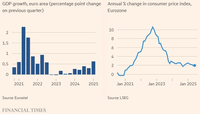 Рост ВВП, еврозона (изменение в процентных пунктах по сравнению с предыдущим кварталом). Годовое изменение индекса потребительских цен, %, еврозона. Источник: Евростат. Источник: LSEG.FT