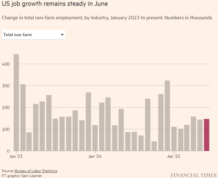 В июне в Соединённых Штатах Америки было создано 147 000 новых рабочих мест, что превзошло ожидания. Это произошло несмотря на неопределённость, связанную с торговой и иммиграционной политикой президента Дональда Трампа.