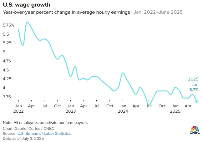 Рост заработной платы в США. Годовое процентное изменение средней почасовой оплаты труда | Январь 2022 г. — июнь 2025 г. Примечание: все сотрудники, работающие в частном секторе, не связанном с сельским хозяйством. Диаграмма: Габриэль Кортес / CNBC. Источник: Бюро статистики труда США. Данные по состоянию на 3 июля 2025 г. CNBC