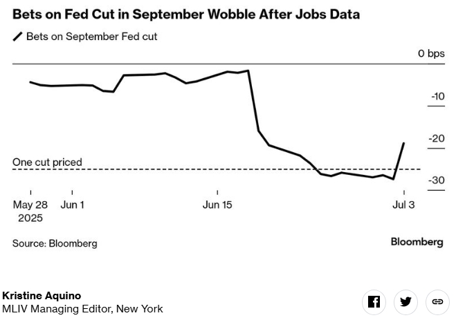 Ставки на сокращение процентной ставки ФРС в сентябре колеблются после данных по занятости. Ставки на сокращение ставки ФРС в сентябре. Источник: Блумберг. Кристин Акино. Главный редактор MLIV, Нью-Йорк