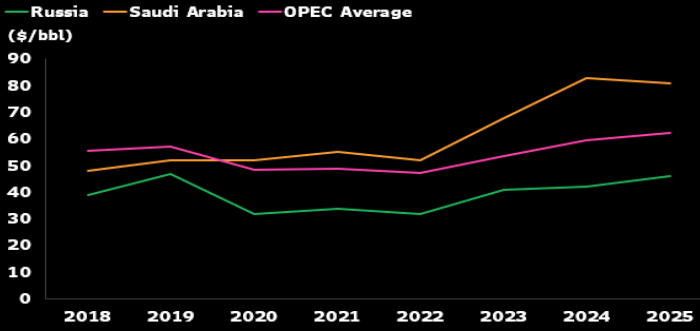 - Для Саудовской Аравии этот показатель составляет $81 за баррель при текущей добыче на уровне 9,1 млн б/с, но он может снизиться до $72 при увеличении добычи до 10+ млн б/с