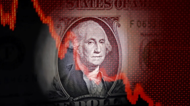 На этой иллюстрации, сделанной 25 апреля 2025 года, видны банкнота доллара США и график снижения акций. REUTERS/Dado Ruvic