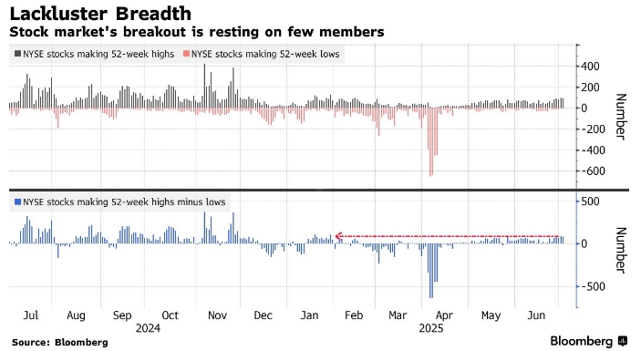 Незначительная ширина. Прорыв фондового рынка зависит от нескольких участников. Акции NYSE достигли 52-недельного максимума. Акции NYSE достигли 52-недельного минимума. Акции NYSE достигли 52-недельных максимумов минус минимумы. Источник: Блумберг