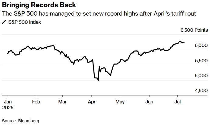 Индекс S&P 500 сумел установить новые рекордные максимумы после апрельского повышения пошлин. Источник: Bloomberg