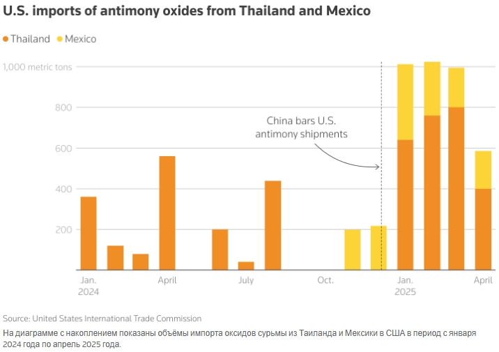 Согласно таможенным данным США, в период с декабря по апрель страна импортировала 3834 метрических тонны оксидов сурьмы из Таиланда и Мексики. Это больше, чем за предыдущие три года вместе взятые.