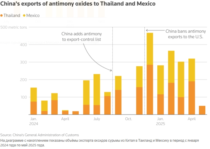 По данным таможенных органов Китая за период с января по май, Таиланд и Мексика вошли в тройку крупнейших экспортных рынков для китайской сурьмы в этом году. Ни одна из этих стран не входила в десятку крупнейших экспортных рынков в 2023 году, который был последним полным годом до введения ограничений на экспорт Пекином.