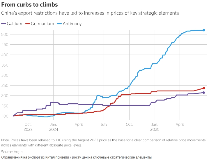 На эти три минерала уже распространялся контроль за лицензированием экспорта, когда Китай запретил экспорт в США. Согласно данным китайской таможни, экспорт сурьмы и германия из Китая по-прежнему ниже уровня, который был до введения ограничений.