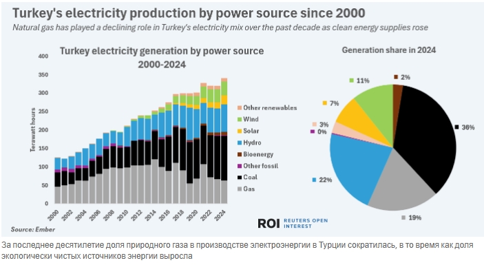 Однако стабильные поставки дешёвого угля привели к снижению спроса на более дорогой природный газ в Турции. В прошлом году газовые электростанции обеспечили лишь 19% потребностей Турции в электроэнергии.