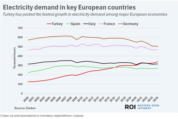 По данным Ember, с 2019 по 2024 год спрос на электроэнергию в стране увеличился на 14%, в то время как в Европейском союзе за тот же период спрос на электроэнергию снизился примерно на 5%.