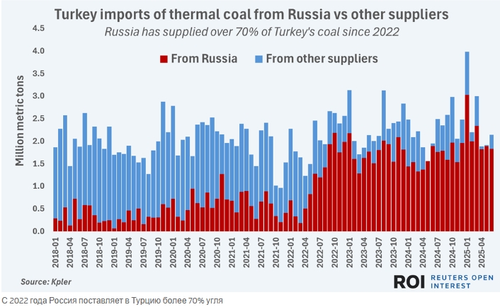 Действительно, в 2025 году Россия обеспечила примерно 88% импорта угля в Турцию по сравнению со средней долей в 24% в период с 2018 по 2021 год, согласно данным аналитической компании Kpler.