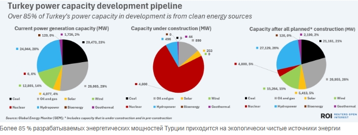 Учитывая, что строится всего 890 МВт новых газовых мощностей и 700 МВт новых угольных мощностей, можно сделать вывод, что в ближайшем будущем в структуре энергокомпании Турции будут преобладать экологически чистые источники энергии, которые после завершения строительства будут составлять более половины от общей мощности.