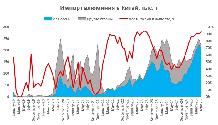 С тех пор резко вырос импорт алюминия из России в Китай. Если в марте 2024 г., то есть на момент введения ограничений США и Великобритании на поставки алюминия из РФ на биржевые склады, доля России в импорте алюминия в РФ составляла 48%, то, например, по итогам мая 2025 г. доля РФ в китайском импорте выросла до 93%. Весной текущего года ежемесячно импорт этого металла из РФ был выше 200 тыс. т. В мае составил 208,3 тыс. т.