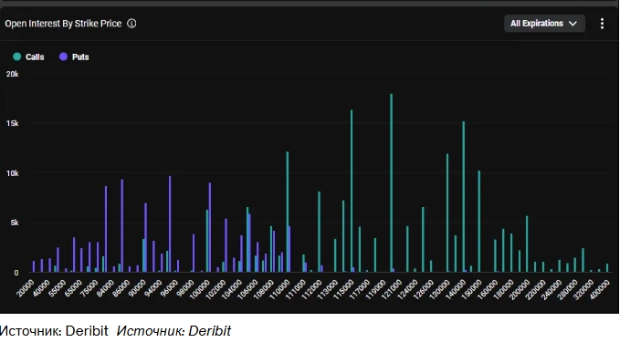 После того как биткоин впервые превысил отметку в 116 000 долларов, открытый интерес, то есть количество неисполненных контрактов на бирже Deribit, сосредоточился вокруг колл-опционов на биткоин с ценой исполнения 115 000 и 120 000 долларов. Опционы с более длительным сроком действия, которые истекают в конце сентября и декабре, демонстрируют повышенный интерес на уровне 140 000 и 150 000 долларов.