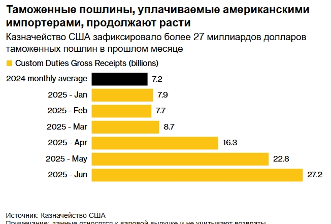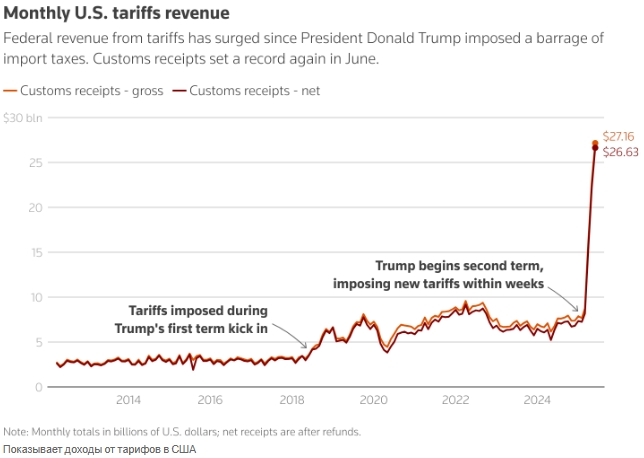 Согласно бюджетным данным, тарифы начинают приносить значительный доход федеральному правительству. В июне таможенные пошлины достигли рекордных значений, увеличившись в четыре раза и составив 27,2 миллиарда долларов брутто и 26,6 миллиарда долларов нетто после возврата средств.