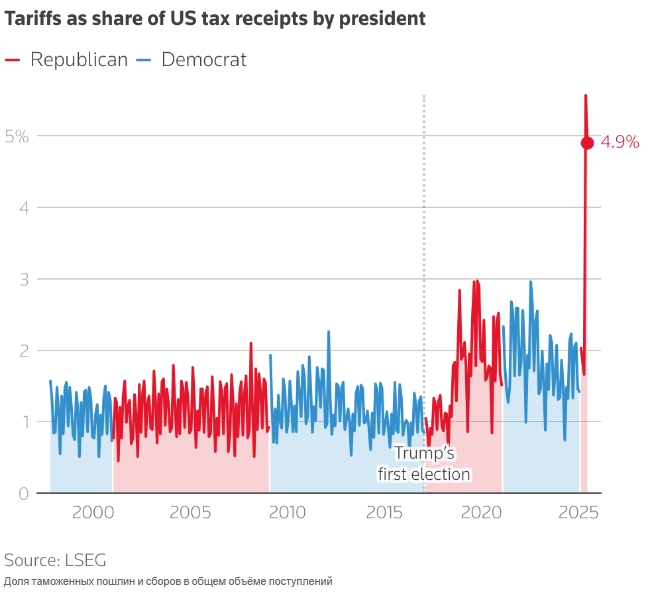 Примерно за четыре месяца доля тарифов в федеральных доходах выросла более чем в два раза — с 2 % до 5 %.