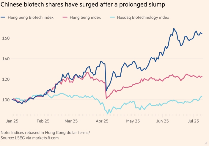 Акции китайских биотехнологических компаний резко выросли после продолжительного спада. Индекс Hang Seng Biotech. Индекс Ханг Seng. Индекс Nasdaq Biotechnology. Примечание: индексы пересчитаны в гонконгские доллары. Источник: LSEG через markets.ft.com