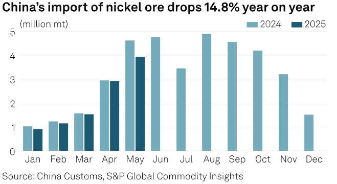 Импорт никелевой руды в Китай упал на 15% год к году.