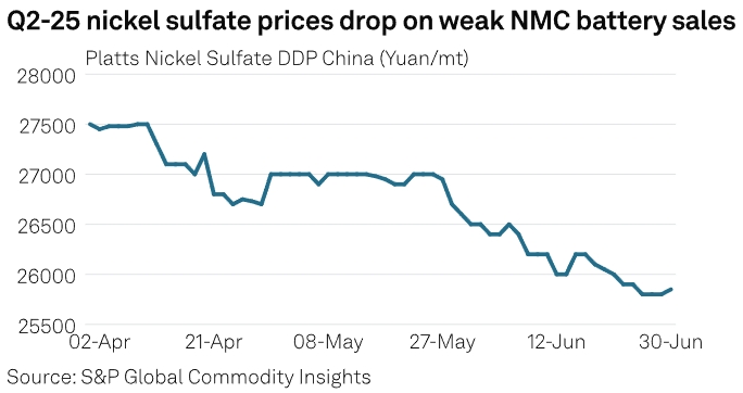Изменение предпочтений в аккумуляторных батареях влияет на цены сульфата никеля, которые во втором квартале отражали общую тенденцию к снижению. Стартовая цена 1 апреля составляла 27 500 юаней за тонну, а затем постепенно снижалась в течение квартала из-за слабого спроса со стороны переработчиков. Участники китайского рынка заявили о проблемах с продажами сульфата никеля, поскольку рынок вступает в традиционное межсезонье, поддержку которому оказывает только замедление поставок MHP.